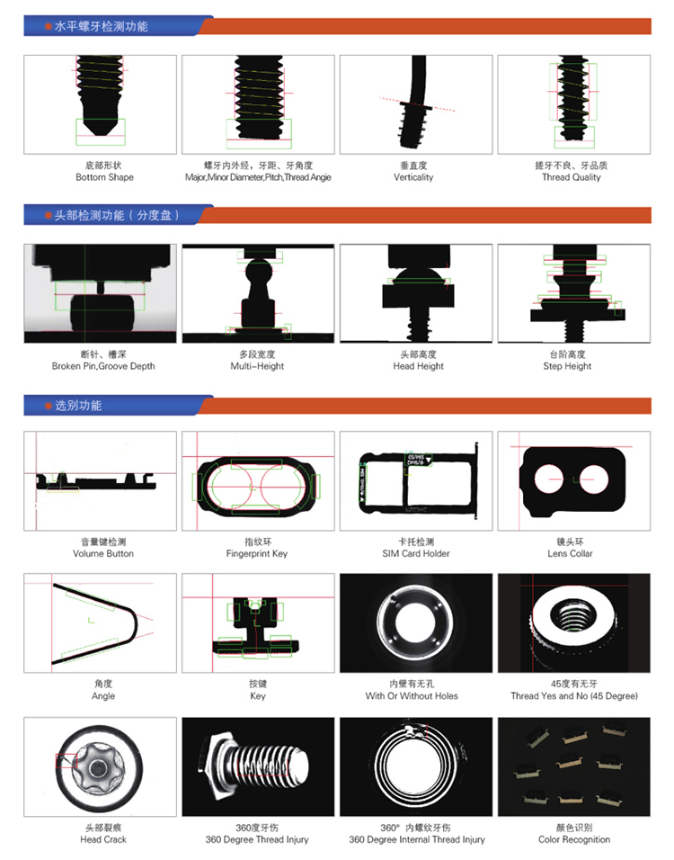 钮扣筛选机是一种自动化钮扣外观尺寸缺陷检测设备,它是光学筛选机的一种,主要用于代替人工对各种类型的纽扣等进行尺寸检测、外观检测、缺陷检测,检测完成后自动筛选分类,检测合格率达100%,大大提高了纽扣的外观尺寸检测精度和检测速度,并且有效降低人工检测成本,视觉检测钮扣筛选机检测纽扣的种类多,检测项目范围广,是很好的纽扣尺寸外观缺陷检测筛选设备。